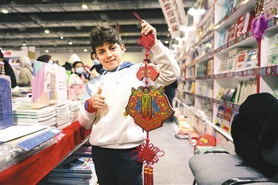 2022年開羅國際書展上,一個男孩在中國圖書展位展示春節裝飾。