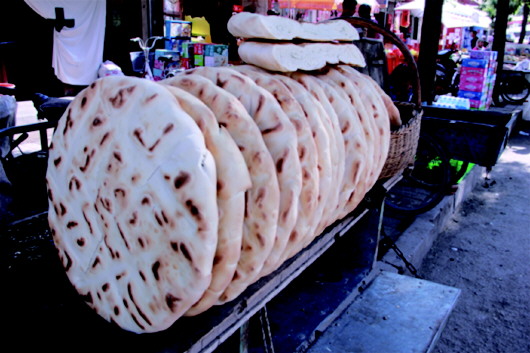 將面粉中加入一定比例的堿水,調和成面團揉入早發酵好的面團,然后再添入大量干面,接下來才是關鍵所在:用堅硬、光滑、沉重的木頭杠子一頭固定(形如杠桿),一頭人工操作,反復揉壓面團,直到將干面團壓成綢子一樣綿軟,再切成1斤、2斤或3斤的面劑子,搟成圓餅狀,抹上清油,撒上少許鹽和胡椒、苦豆、姜黃等佐料,最后將面餅卷起來,豎立壓制成團,再用木杠搟壓成厚而大的圓餅,并在上面用干凈的梳齒等工具精心旋出花紋圖案,抹少許清油,便可上鏊烘烤。