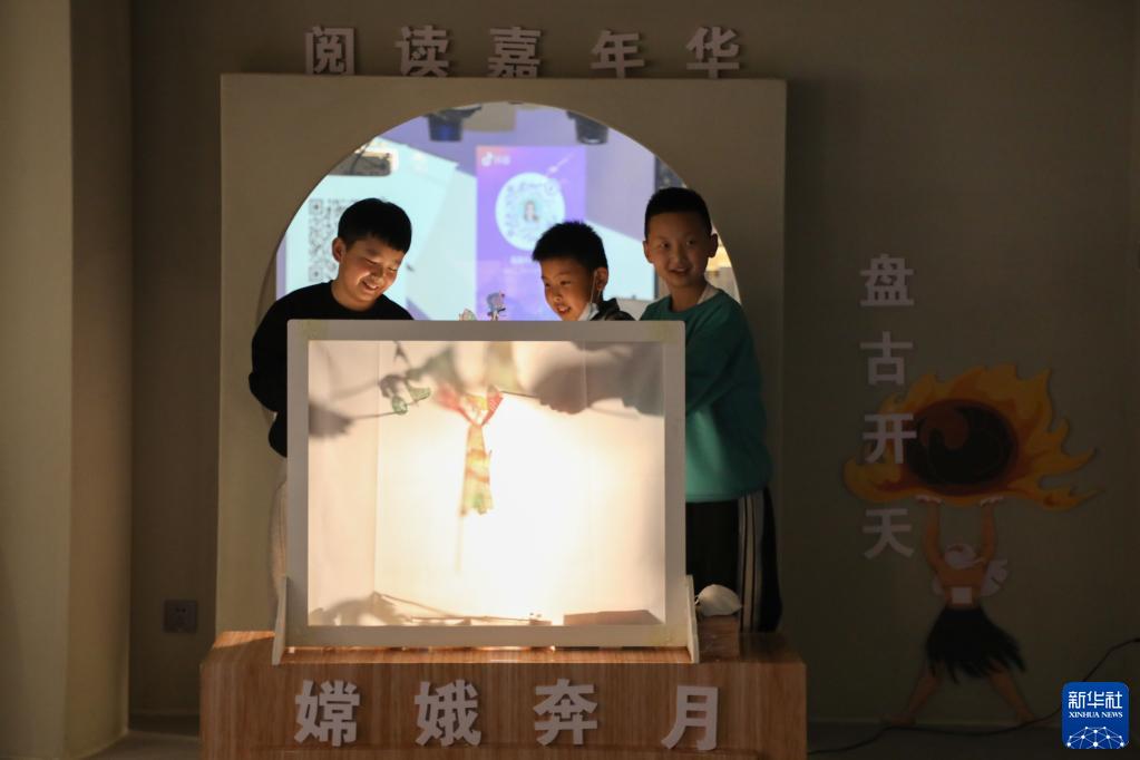 4月1日,在甘肅省蘭州市的讀者出版集團數字閱讀中心讀者小站,小朋友體驗中國神話故事主題皮影戲。新華社記者 馬希平 攝
