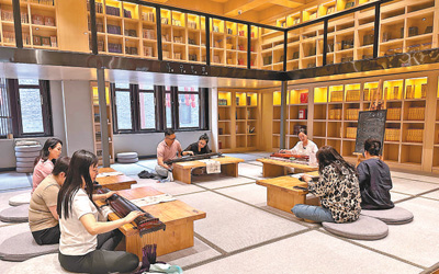圖為讀者在沈陽老北市漢字主題書房學習彈奏古琴。記者 胡婧怡攝