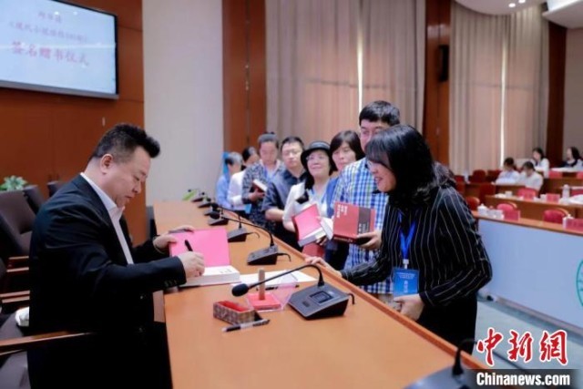 圖為邱華棟向部分參會代表進行現(xiàn)場簽名贈書。 內(nèi)蒙古師范大學(xué)供圖