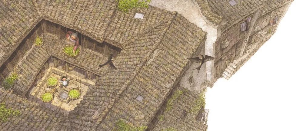 整個繪本主要采用寫實性的現實主義風格,繪畫者付出極大的耐心和精力,用鋼筆和馬克筆細致描繪每一片磚瓦、每一塊石板、每一叢花葉、每一扇門窗,甚至每一條木紋、每一絲波紋、每一道皺紋……力求真實地呈現物像的肌理和質感,讓人身臨其境。同時,也加以寫意的手法,用柔和的淡彩渲染懷舊的色調和溫馨的氛圍。尤其值得稱道的是,在多幅畫面中,以丫丫等待的“神秘的客人”——燕子為一種符號角色,無論之于畫面還是主旨,都有其獨到的意義。燕子飛翔于水面和屋宇之上,給靜態的環境帶來靈動之感,有時還能平衡畫面的結構。燕子是江南春天的使者,也是童年喜愛的精靈。蘇軾和歐陽修各自的《蝶戀花》詞中都寫到了燕子,前者是:“花褪殘紅青杏小。燕子飛時,綠水人家繞。”后者是:“畫閣歸來春又晚。燕子雙飛,柳軟桃花淺。”這一古典意象在繪本畫面中的反復出現,羽翼間展開了江南的典雅、清麗以及輕愁。作品里的另一種動物是時常縈繞主人腳邊的貓咪,增添了祥和的家居趣味,也代表一種熟稔的情感皈依。原本黑瓦白墻的江南民居在畫面中作為背景或前景,灰中帶彩、冷中帶暖,既體現了時間的流逝,也象征著永恒的家園。外公背著丫丫雨夜歸家的場景以多個連貫畫面變換角度來鋪展,暗夜中始終有溫暖的燈光照亮回家的路,也有堅實的后背托舉稚嫩的夢,給孩子以安全、安穩和安心。