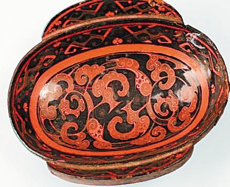 這一時(shí)期漆器上的幾何紋畫,主要有菱形紋、三角紋、圓圈紋、平行線紋等。如武威磨嘴子4號(hào)漢墓出土的漆缽,其腹、底部交接處繪二方連續(xù)菱格紋,菱格內(nèi)填圓圈紋和渦漩紋,口內(nèi)次要部位則繪幾何平行線紋。