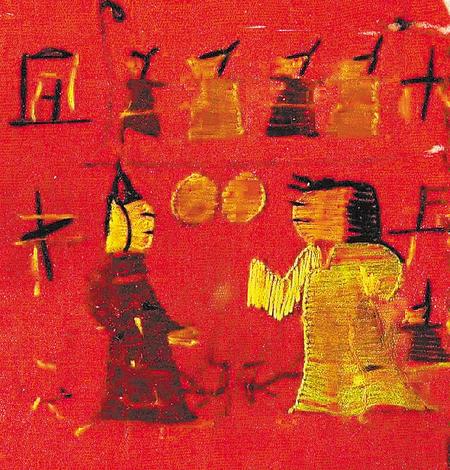 武威磨嘴子漢墓出土的一件彩繪人物木板畫,長(zhǎng)37.6厘米,寬12.2厘米。白粉敷底,紅、黑雙彩,有相對(duì)而立的主、婢二人。黑色發(fā)髻,紅色交領(lǐng)寬袖深衣,均用墨線勾勒輪廓。右側(cè)還繪有一棵樹。線條流暢,形象生動(dòng)。武威磨嘴子漢墓還出土了一件木板飼豬圖,長(zhǎng)36.3厘米,寬8.1厘米,厚1.1厘米。左側(cè)墨繪穿寬袖深衣之人,高髻,右手前伸,似欲喂食,右側(cè)墨繪豬一頭,拱嘴翹尾,并用墨線繪出豬鬃,同樣顯得線條流暢生動(dòng)。
