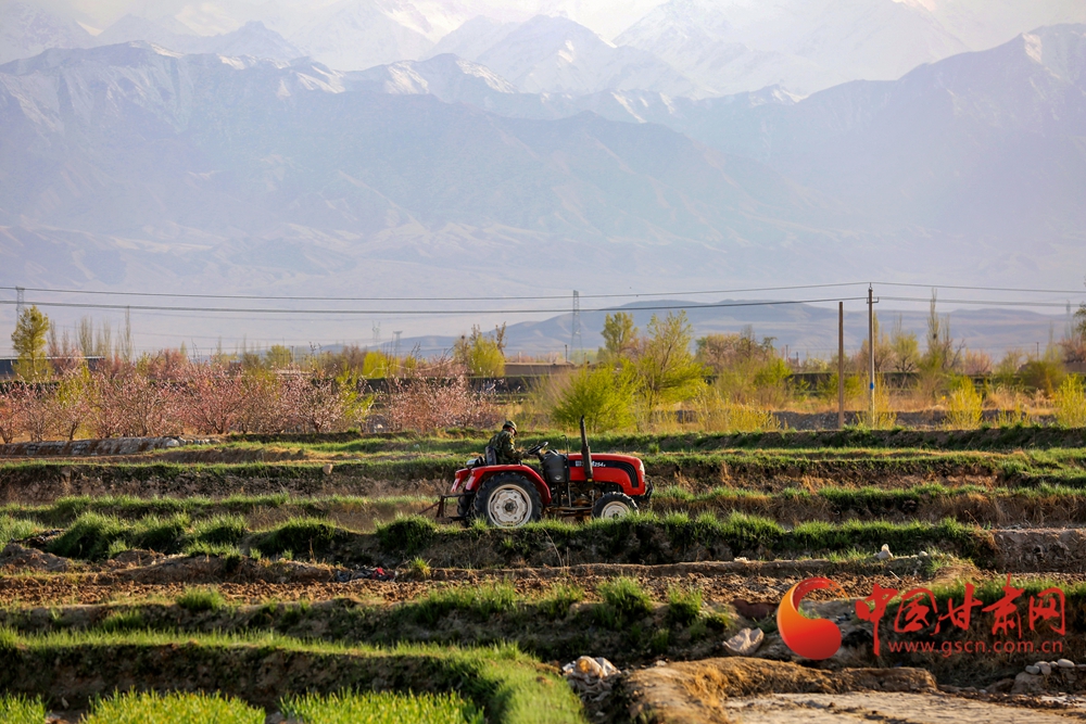 谷雨時節,甘肅省酒泉市肅州區西洞鎮農民搶抓農時,忙碌在田間地頭,遠處的祁連山與近處的田園風光,構成了一副美麗的春日農耕畫卷。