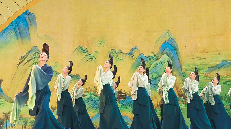 圖為圍繞傳世名作《千里江山圖》創排的舞蹈詩劇《只此青綠》亮相2022年中央廣播電視總臺春節聯歡晚會(視頻截圖)。 中央廣播電視總臺供圖