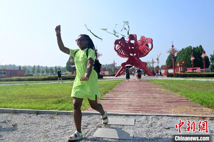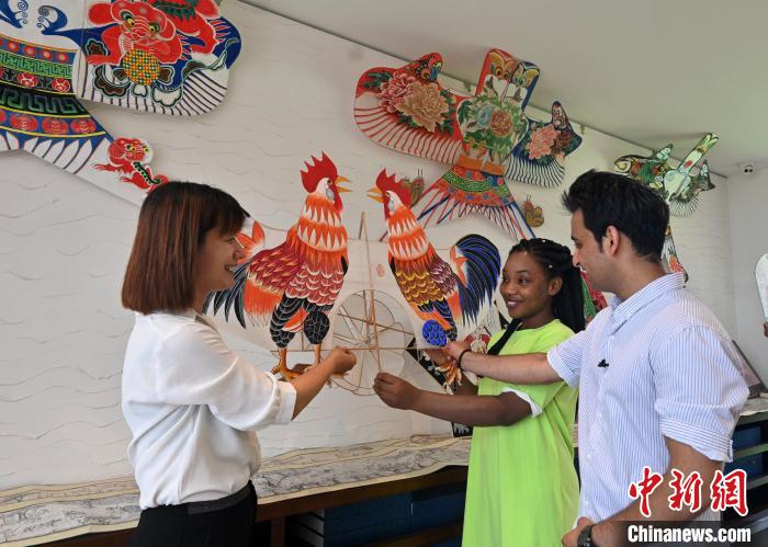 中新網廊坊7月21日電 (李玉素 宋敏濤)21日,來自河北師范大學的尼日利亞籍留學生馬臻和巴基斯坦籍留學生烏瑪爾,來到河北省廊坊市安次區第什里風箏小鎮,體驗中國傳統的風箏文化。
