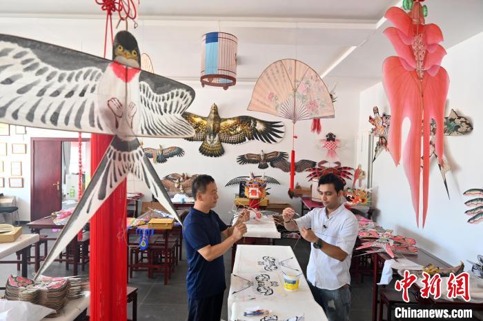 巴基斯坦籍留學生烏瑪爾(右)跟隨第什里風箏第五代傳承人趙艷強(左)學習傳統風箏制作。 翟羽佳 攝