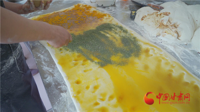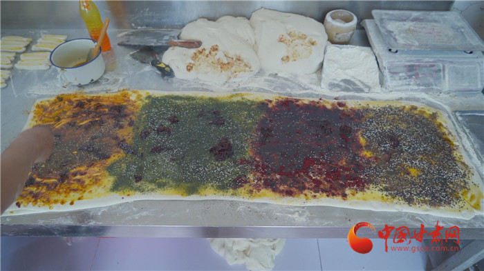 記者走進(jìn)榆中縣金崖鎮(zhèn)浩燕饅頭店,一股濃濃的胡麻油、玫瑰醬、香豆等混合的香氣撲面而來,李浩燕正在忙碌地趕制一批榆中傳統(tǒng)手工月餅。案板上除了發(fā)好的面團(tuán),還擺上了炒胡麻碎、姜黃、白砂糖等豐富的佐料。只見李浩燕從揉面開始,然后鋪餡、搟制、卷面、切分、披花,一道道工序一氣呵成。經(jīng)過一個(gè)多小時(shí),新鮮美味的月餅出爐了,切開后,內(nèi)里豐富,色彩斑斕,咬上一口軟糯可口,回味留香。