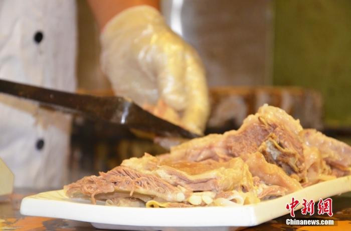 資料圖為8月12日,蘭州主城區某手抓羊肉招牌老店內,店員正在切新鮮的東鄉羔羊肉。 中新社記者 李亞龍 攝