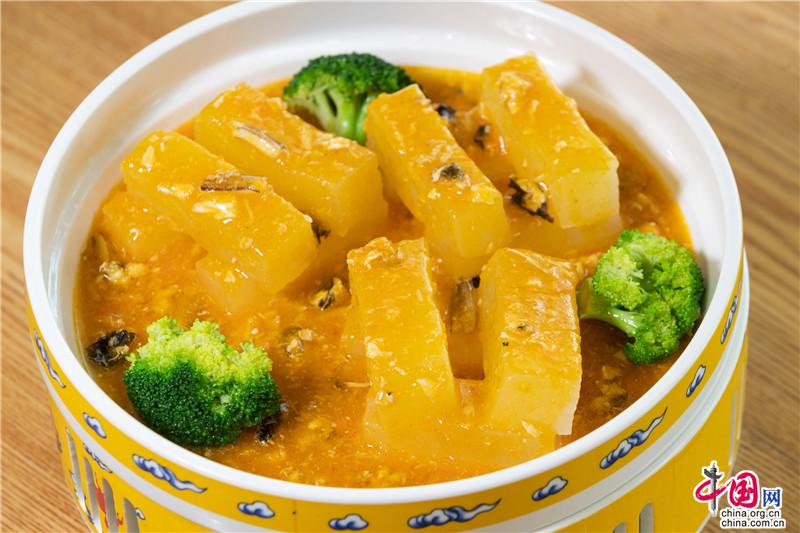 肉質緊密的成熟冬瓜以高湯煨過,有股翡翠的溫潤通透。以新鮮金燦的蟹黃粉掛芡調味,入口即化,在齒頰間迸出幽幽的鮮味,醇厚的口感又不乏清新爽口的層次。