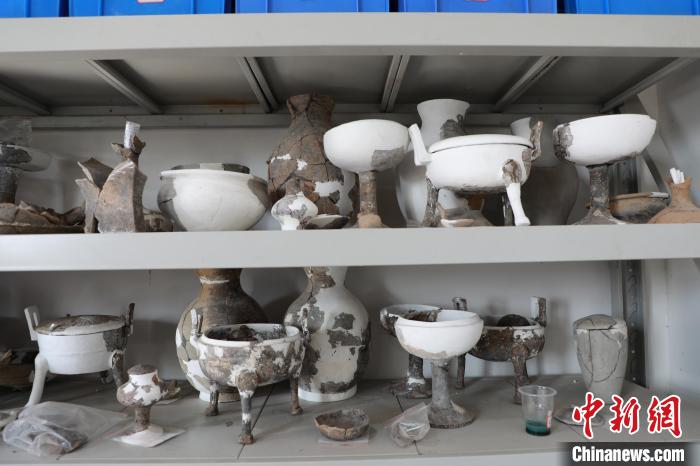 劉勇介紹,考古現場出土的文物碎片,就好比不同的樂高積木混在一起,需要分門別類地梳理出來。每一個編織袋里裝有一件器物,事先已經在考古工地現場進行了初步分類,接著就是清洗清理碎片上的泥土,再而拼接、粘接、補石膏、打磨……