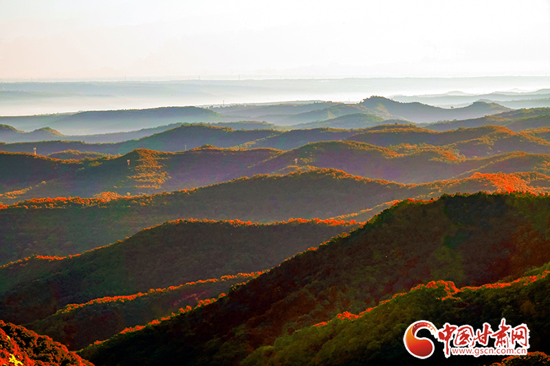 初冬時節,在夕陽的映照下,平涼市唐帽山省級森林公園云霧繚繞,山巒在云霧中若隱若現、如夢如幻,呈現出仙境般美景。
