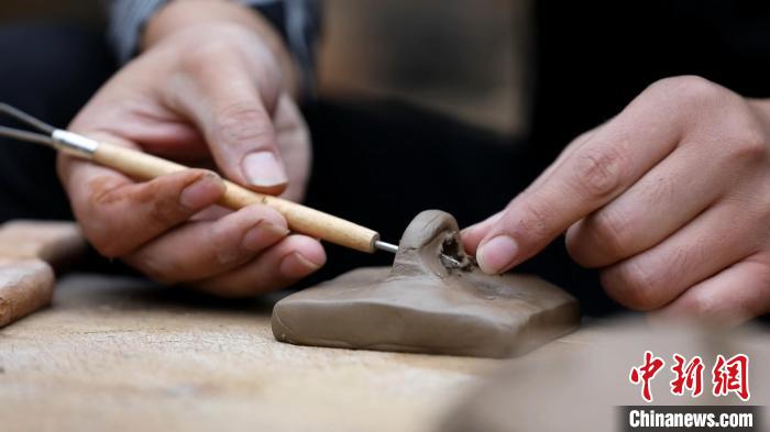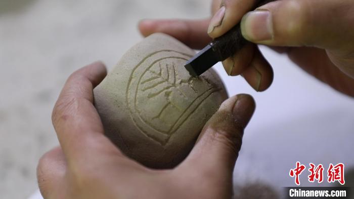 蔣繼濤說,柴燒陶印的制作過程,結合了書法繪畫、手工雕塑等技藝。“陶印的制作流程主要包括選土、配土、過濾、沉淀、制紐、晾曬、打磨、篆刻、入窯、燒制等程序,不僅要精通書法篆刻,還要熟悉雕法、燒窯等。”蔣繼濤一邊介紹,一邊手持刻刀。鋒利的刀尖在陶印上不斷游走,吹去浮塵,一枚古樸的柴燒陶印制作完成。