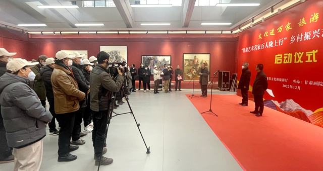 12月17日上午,“甘肅藝術名家百人隴上行”鄉村振興藝術創作工程采風活動在甘肅畫院正式啟動,來自全省各地的藝術家從蘭州黃河之濱,奔赴甘南、隴南兩地重點旅游示范村開展創作采風活動。省委宣傳部副部長、省文旅廳黨組書記何效祖出席啟動儀式并講話。省文化和旅游廳黨組成員、副廳長萬學科主持啟動儀式,甘肅畫院院長王萬成,甘肅文旅集團黨委副書記、工會主席王寧等出席啟動儀式。
