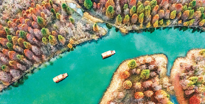 近年來,江蘇省宿遷市宿豫區大力發展“農旅+產業+文化”鄉村旅游,圖為宿豫區新莊彬荷園濕地里,五彩斑斕、錯落有致的紅杉樹與清澈碧綠的河水相互映襯,猶如一幅色彩艷麗的“杉”水畫。陳紅 攝(人民圖片)