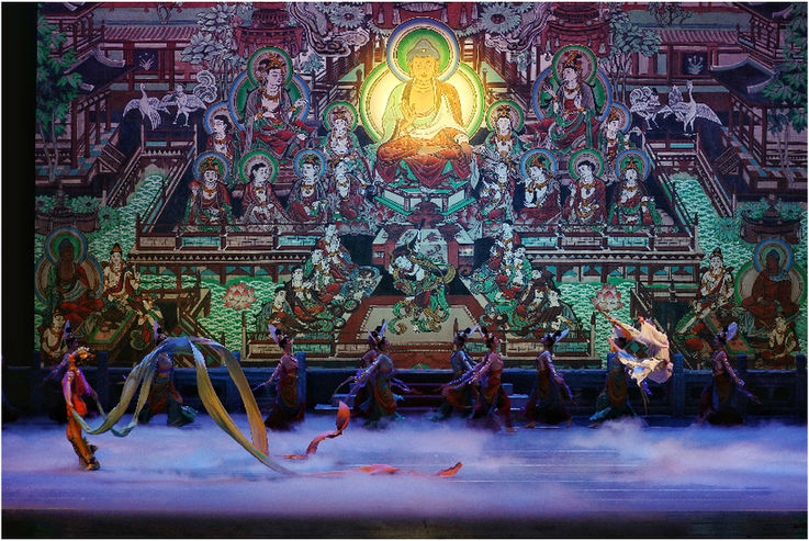 例如,僅一段英娘賣藝的舞蹈,就由100多幅敦煌壁畫中的舞姿形象編排而成,舞蹈節奏抑揚頓挫,舞姿優雅靈動;而“千手觀音”“反彈琵琶”“伎樂”“小雜耍”“黑巾舞”“霓裳羽衣舞”等舞姿,則是出自莫高窟第3窟、第112窟、第321窟、第184窟的壁畫。