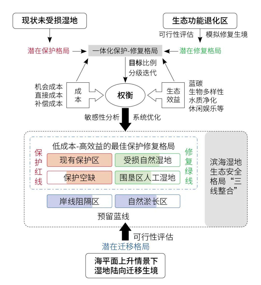 就濱海濕地而言,如果缺乏修復(fù)選址對濱海濕地生態(tài)系統(tǒng)整體格局和生態(tài)功能效益影響的系統(tǒng)評估和優(yōu)化,則有可能導(dǎo)致選址不當(dāng),難以在保護(hù)殘存自然濕地同時,有效修復(fù)具有潛在生態(tài)系統(tǒng)服務(wù)協(xié)同效應(yīng)的受損濕地。