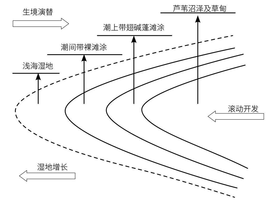 文章強調(diào),在較長時間尺度上,海平面上升將驅(qū)動濱海濕地陸向遷移并不斷塑造新生濱海濕地生態(tài)系統(tǒng)。然而,高強度圍填海及圍墾開發(fā),以及堤壩、道路等基礎(chǔ)設(shè)施建設(shè)阻斷了陸海之間的水文和生物連通,人工硬質(zhì)化地表徹底改變了生境條件,擠壓了鹽沼等植物群落陸向遷移的空間,使濱海濕地生態(tài)系統(tǒng)逐漸喪失應(yīng)對海平面持續(xù)上升的適應(yīng)性,最終退化消亡。
