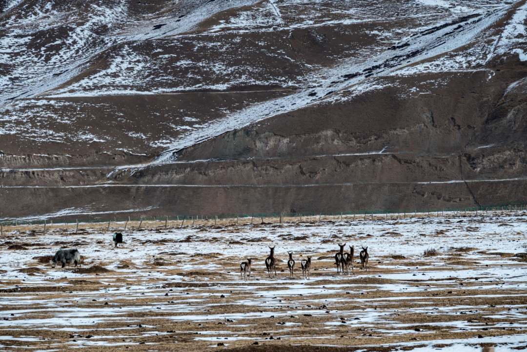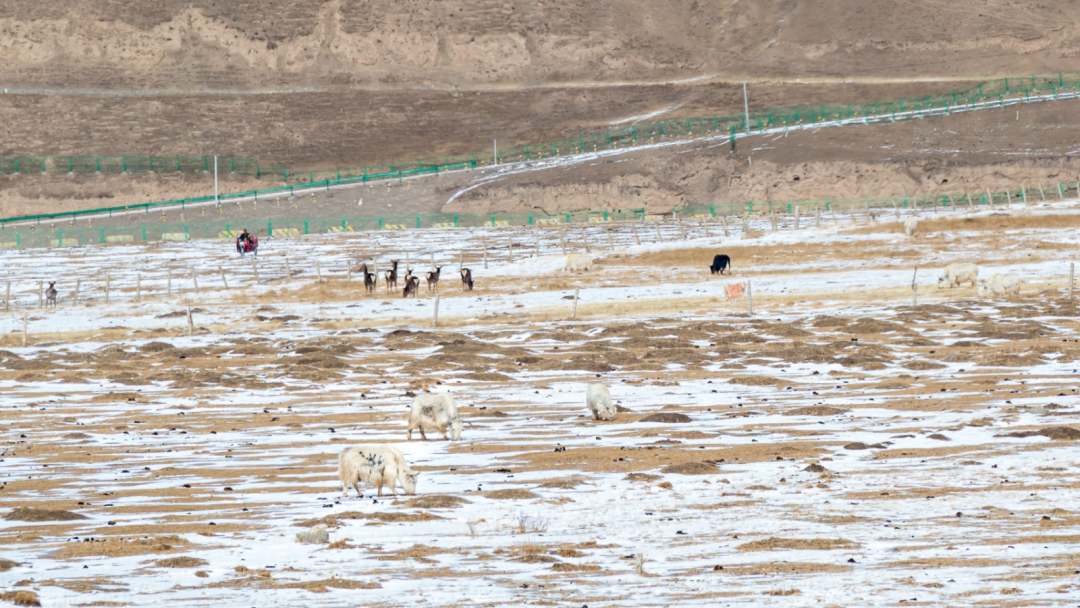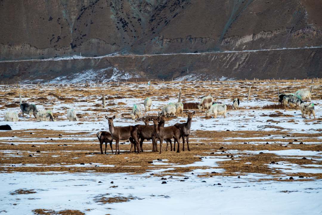 近日,在武威市天祝藏族自治縣抓喜秀龍草原上,野生的狍鹿和牧民家養的白牦牛同食牧草,構成一幅和諧動人的自然圖景。張廷愛攝。