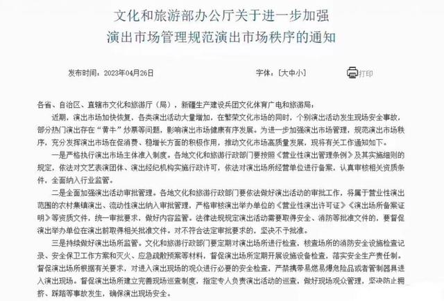 四是重點加強大型演出活動現場監管。對臨時搭建舞臺、看臺的演唱會、音樂節等大型演出活動,文化和旅游行政部門要做好演出現場監管,查驗演出舉辦單位的演出批準文件及相關手續,核驗演員信息及演出節目內容,嚴禁擅自變更演員及演出內容,嚴禁假唱、假演奏等違法違規行為。要配合公安部門做好現場安全管理,堅決防范演出安全事故發生。