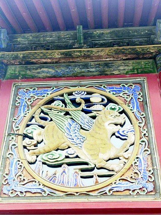 戲樓二樓為戲臺,其當心間安裝六抹活扇隔扇門,唱戲時這些門扇可以臨時取下。二樓檐下裝透雕栱間板,雕刻內容有蓮花、牡丹、二龍捧壽等,寓意福壽連連、富貴清廉。兩盡間檻窗鏤雕翼龍、翼虎圖案。虎嘯而風生,風生而萬籟皆作,虎伏而風止,風止而萬籟皆息。而《廣雅·釋魚》中記載:“有翼曰應龍。”可見,這翼龍、翼虎暗含風調雨順的美好期盼。