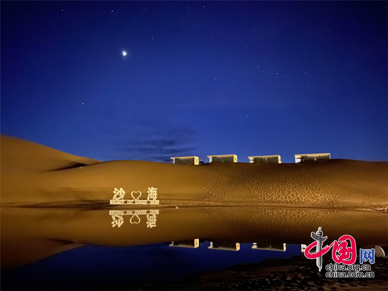 在沙漠區,游客晨觀大漠日出,昏賞沙海夕陽,夜晚宿在星星酒店,感受躺在床上看星星的奇妙體驗,在星咖啡手工制作星星原木版畫,在五行沙療室滋養生命的每一個細胞,在觀星谷跟著星空講師春看獅子座、夏觀銀河、秋尋仙女座、冬追獵戶座,期待與一場流星雨的不期而遇。