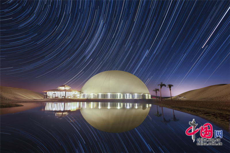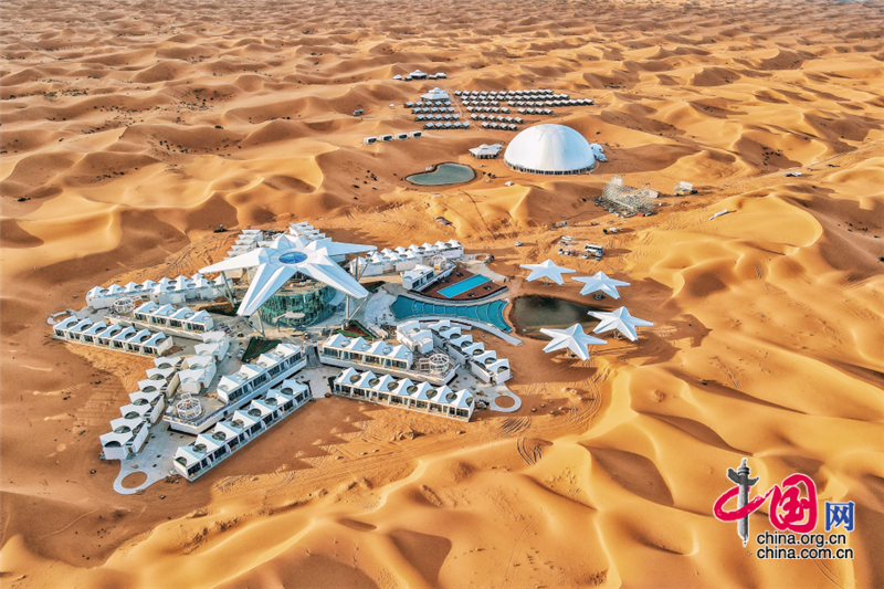 沙坡頭旅游區依托良好的生態資源,打造了國內首個以沙漠觀星為主題打造的酒店——星星酒店,在蒼茫遼闊的沙漠之中,這座造型獨特的酒店仿佛星星一般,閃爍其中。