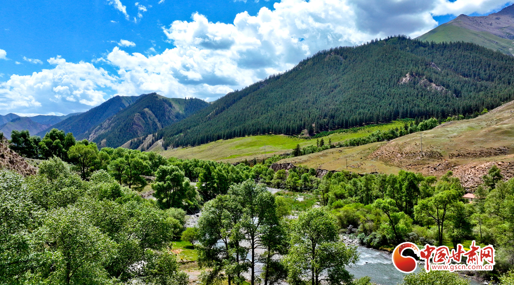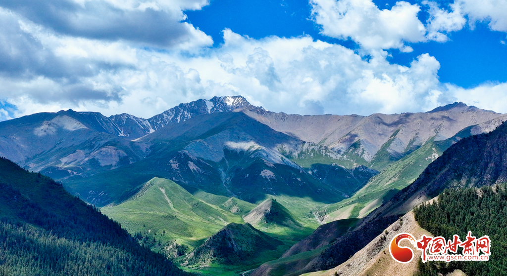 6月29日,在祁連山國家公園甘肅省張掖市肅南裕固族自治縣大河鄉段,藍天白云下,巍峨壯麗的祁連山蒼松翠柏,水光粼粼,構成一幅美麗的畫卷。