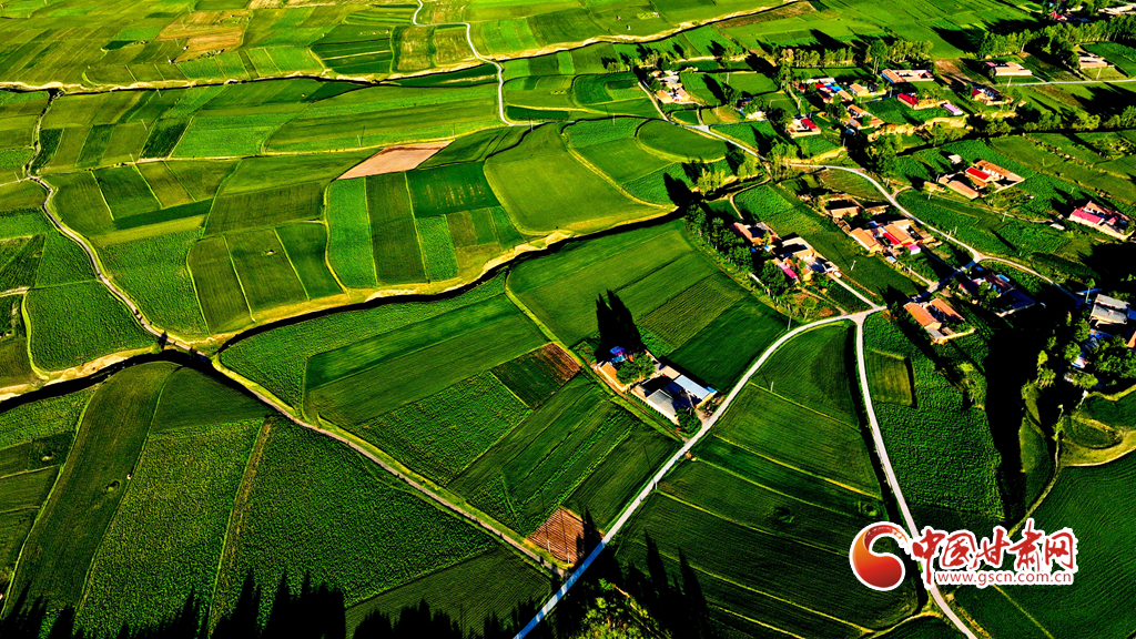 夕陽映襯下的祁連山北民樂縣豐樂鎮易家灣村,綠油油的莊稼生長旺盛,林木蓊郁層林盡翠,呈現出生機勃勃的景象,猶如“巨幅綠毯”。