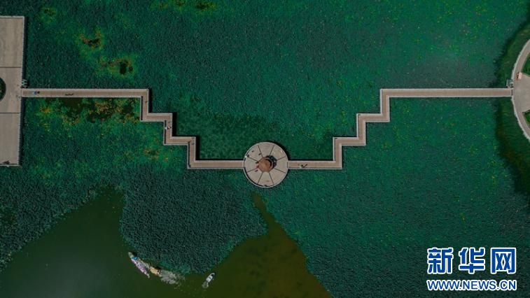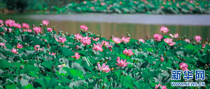 近日,在甘肅省白銀市白銀區水川黃河濕地公園,滿池荷花嬌艷、荷葉青翠,藍天、碧水、嬌花、翠葉構成了一幅秋日美景圖。新華網發(郭宏 攝)