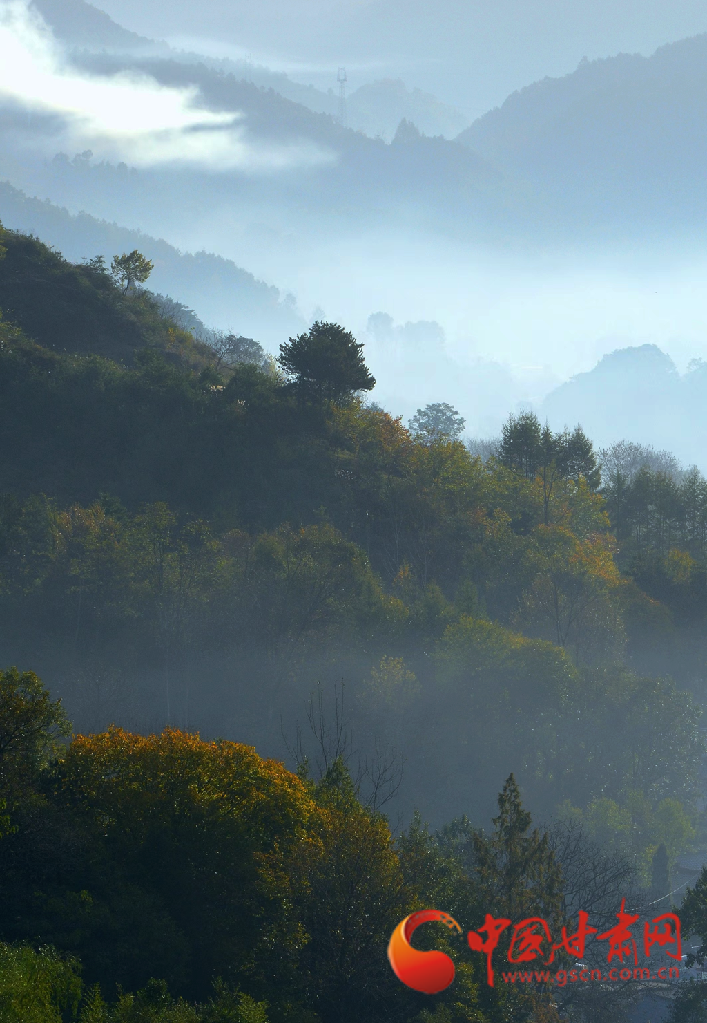 進入十月,康縣的秋景漸入佳境,秋日的暖陽透過薄霧灑在五彩斑斕的山脊上,滿山層林盡染、渾然一體,好似一幅油彩畫。