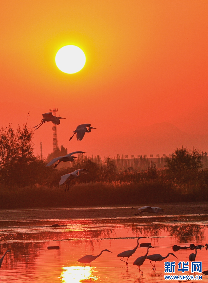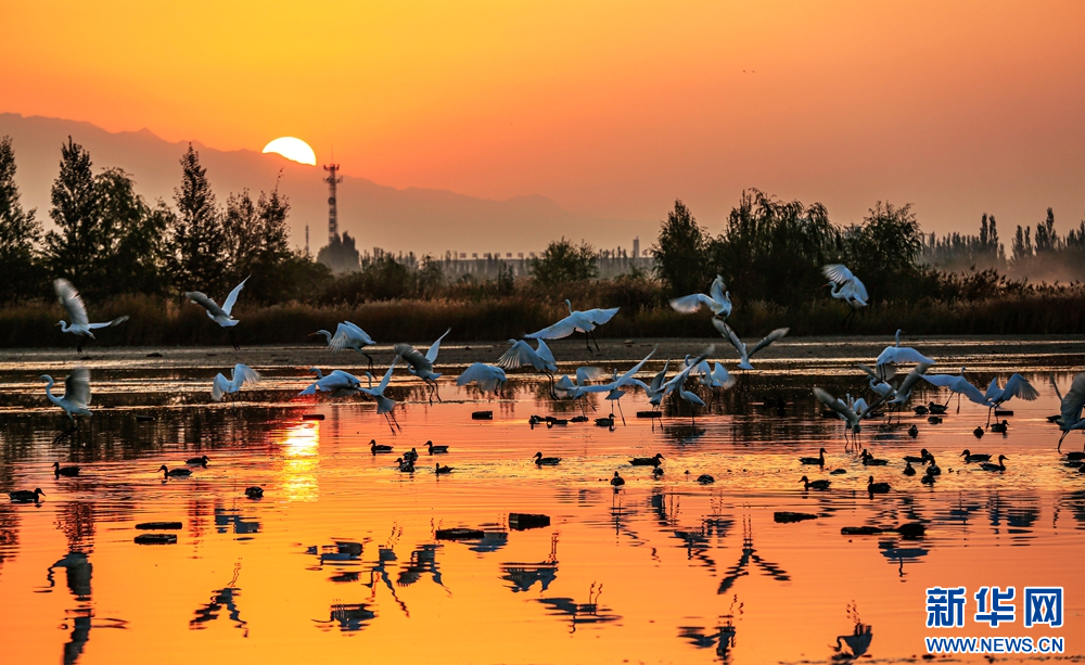 近日,在甘肅省張掖國家濕地公園,成群的白鷺迎著朝陽悠然自得地飛翔、覓食、嬉戲,構成了一幅朝陽伴鷺飛的美麗畫卷。新華網發(陳禮 攝)