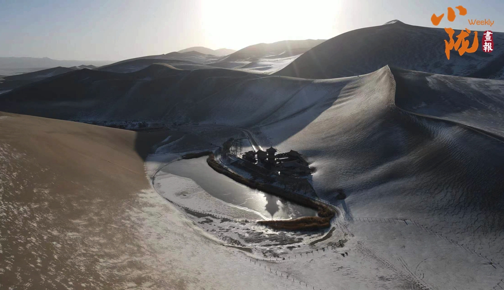 從空中俯瞰,漫漫沙漠覆蓋著白雪,月牙泉成了沙漠的眼睛,構(gòu)成另一幅美麗的沙海畫卷。