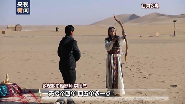 敦煌旅拍攝影師 李建杰:游客量變化還是挺大的,往年沒有這么多人。我作為一個攝影師,一天接四單,四五單多一點。