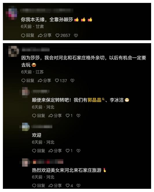 此前,多位網友向石家莊市文化廣電和旅游局官方賬號“石家莊文旅之聲”留言,表示想看國乒名將孫穎莎代言家鄉。公開資料顯示,出生于河北省石家莊市的孫穎莎在此開啟了乒乓球生涯。