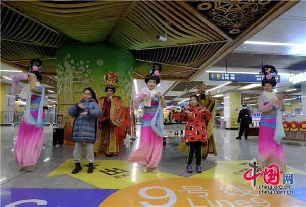 2020年底,西安地鐵9號線開通之際,華清池站帝妃攜仕女表演的《霓裳羽衣舞》,秦王攜眾臣高呼“我們有地鐵了”的聲音依舊回旋耳邊。時值龍年新春佳節,廣大乘客在乘坐安全舒適西安地鐵9號線的同時,將再次有機會在地鐵車站和地鐵列車上來一場“秦唐”文化的穿越之旅。