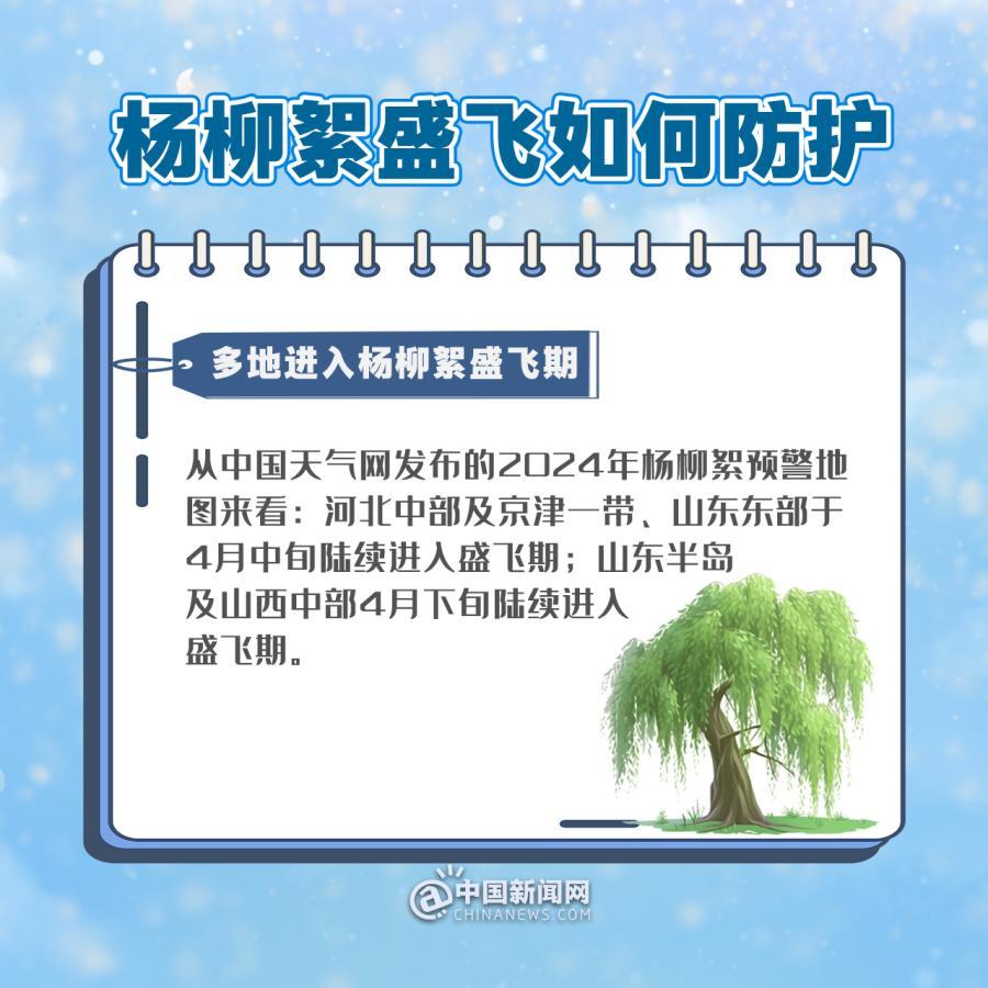 從中國天氣網發布的2024年楊柳絮預警地圖來看:河北中部及京津一帶、山東東部于4月中旬陸續進入盛飛期;山東半島及山西中部4月下旬陸續進入盛飛期。楊柳絮都有哪些危害?公眾日常如何做好防護?