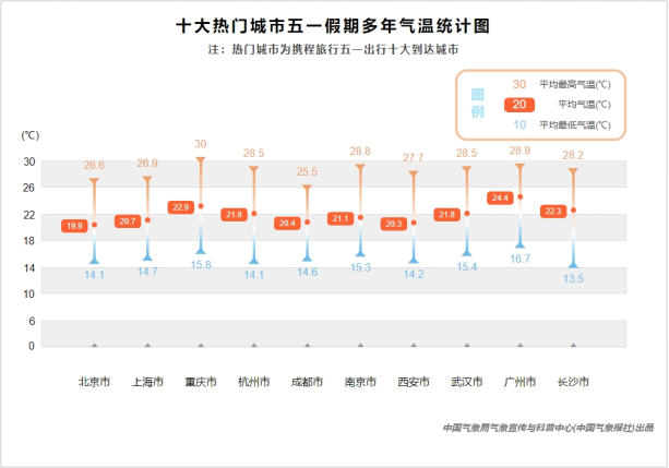南北方熱門城市“五一”假期的氣溫差異并不大,都非常適宜出行,最高氣溫均在25℃以上。重慶是唯一一個在“五一”期間平均最高氣溫達到30℃的熱門城市,熱度與溫度都在高位,前往還需注意防暑降溫。