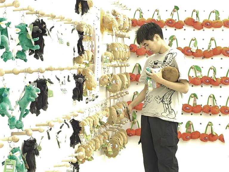 7月17日上午11時,藝術生活館內,來自西安的大學生小朱入手兩個綠馬、一個甘肅麻辣燙毛絨玩具、兩盒禮品包裝三炮臺。“送家人,送同學,都很好。我感覺這兒越逛越好玩,不虛此行。”小朱說。
