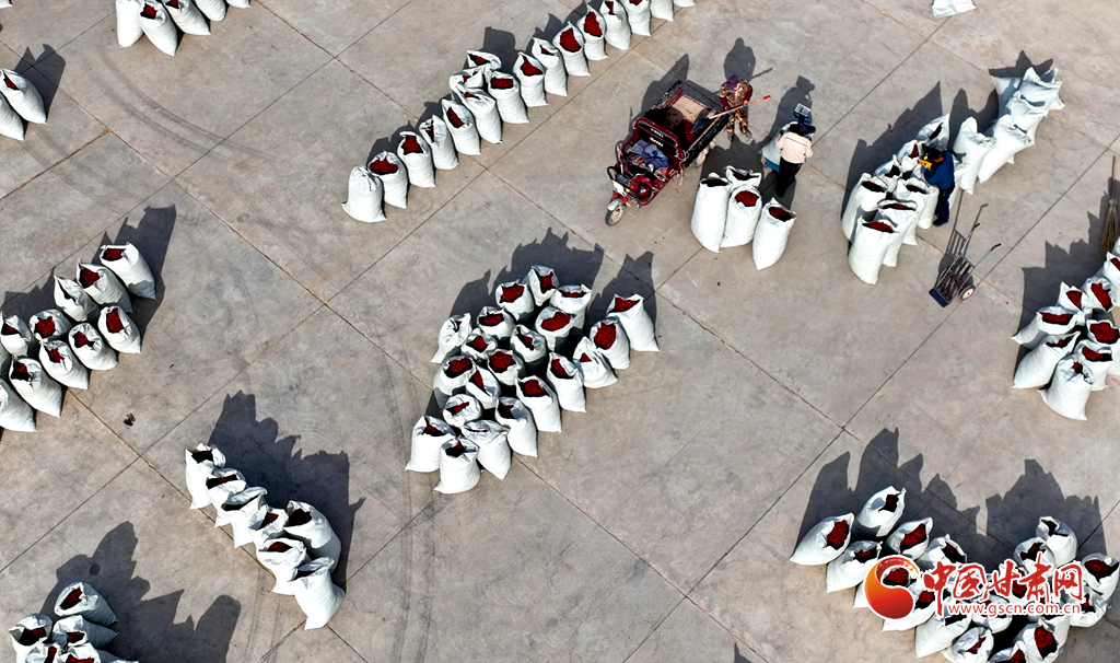 10月29日,張掖市臨澤縣新華鎮勝利村辣椒加工廠內,工人們正在為河南、山東的客商加工500噸紅辣椒干。