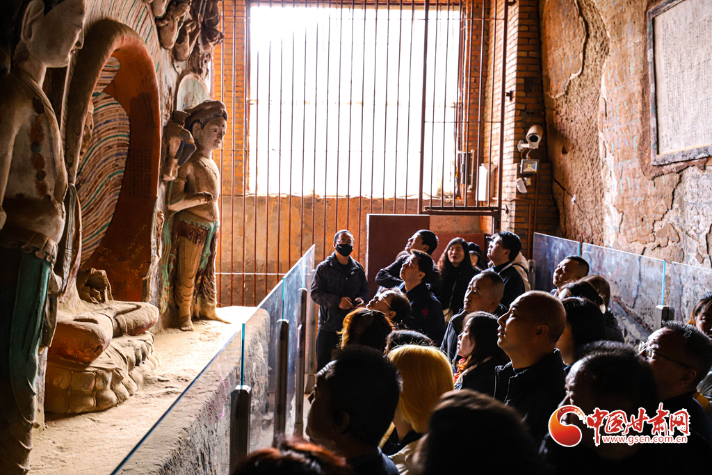 11月9日,甘肅省張掖市肅南裕固族自治縣馬蹄生態文化旅游景區金塔寺石窟內,甘肅百家旅行社的導游們正在仔細觀賞千年石窟。