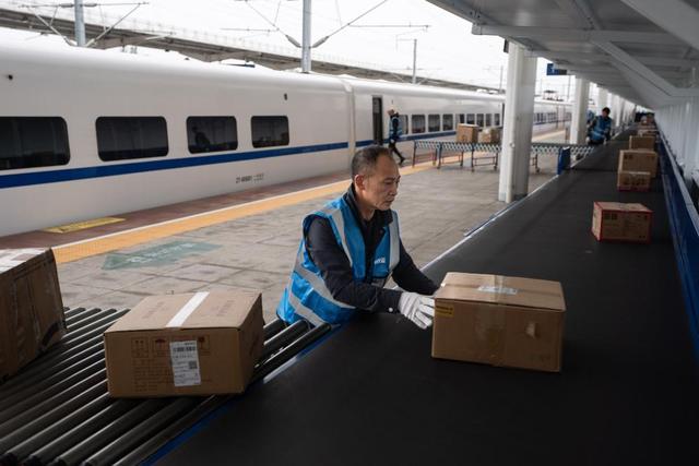11月11日,在成都雙流西站,工人將電商快件從動車上搬運下來。新華社記者 江宏景 攝