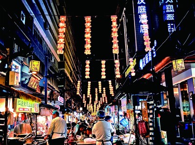 從亞歐商廈向東行,不久便到了張掖路步行街。夜幕降臨,夜市攤車的燈帶漸次亮起,也為這座城市的夜生活打開了開關。