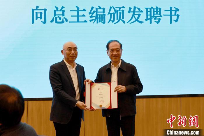 上海世紀出版集團黨委副書記、總裁闞寧輝向韓啟德總主編頒發聘書?!∩倌陜和霭嫔?nbsp;供圖