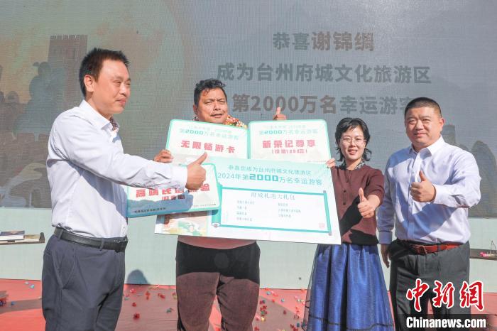 當日9時33分,臺州府城景區智慧旅游系統自動鎖定第2000萬名游客所在的一支來自福建的旅行團,經過數據確認和復核,確定旅行團成員謝錦綢為第2000萬名游客。臨海為其準備了包含大宋風華定制游、府城十味大禮盒、新榮記旗下品牌餐廳尊享券、臺州府城IP形象文創禮盒等禮品的“好事來臨”府城大禮包。