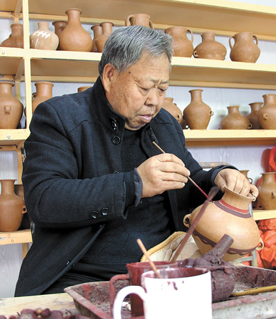 64歲的閻建林(見(jiàn)圖,本報(bào)記者趙帥杰攝)是甘肅省級(jí)非物質(zhì)文化遺產(chǎn)項(xiàng)目陶器制作技藝代表性傳承人。走進(jìn)他位于定西市臨洮縣洮陽(yáng)鎮(zhèn)河口村的家中,院落里、窗臺(tái)上,擺滿(mǎn)了大大小小的陶器,足有上百種。“主要是馬家窯彩陶工藝品,敞口的是盆,帶頸的為罐,耳部安有提手的,還可以稱(chēng)作壺。”閻建林介紹。