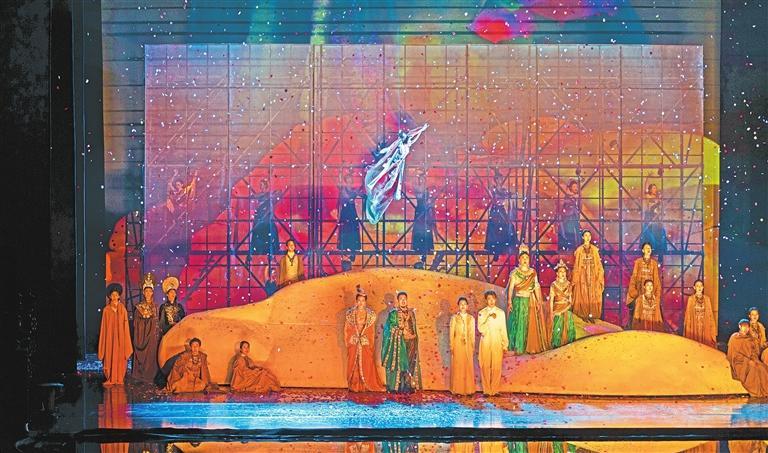 大型原創(chuàng)音樂(lè)劇《飛天》以“大愛(ài)”立意敘事,打破時(shí)空界限,利用現(xiàn)代舞美技術(shù),多維度、多角度、多層次地展現(xiàn)了敦煌石窟的無(wú)窮魅力,令觀眾身臨其境、沉浸其中,情感共鳴油然而生,獲得獨(dú)特的藝術(shù)體驗(yàn)。(本文配圖均為《飛天》劇照,由蘭州大劇院提供)