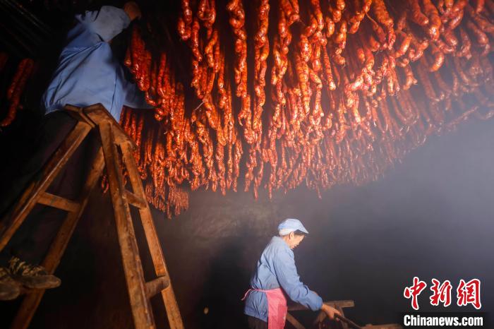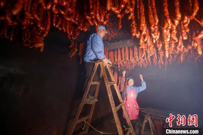 圖為貴州施秉一企業工人在下架剛熏制好的香腸。新年臨近,貴州省黔東南苗族侗族自治州施秉縣部分農戶和企業紛紛加工趕制臘肉、香腸、血豆腐等傳統臘味,通過“線上+線下”銷售方式,供應市場,喜迎新年。磨桂賓 攝