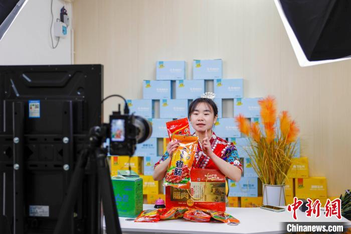 圖為貴州施秉一主播在推介熏制的臘肉、香腸等特色農產品。磨桂賓 攝